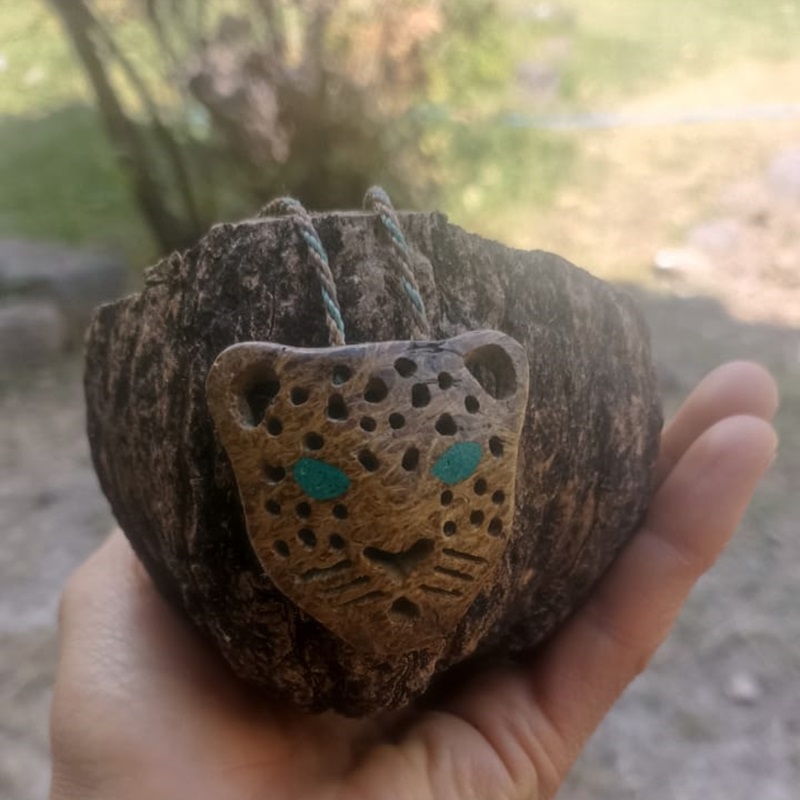 El collar "Jaguar de la Selva" está elaborado artesanalmente con castañas, representando la cara de un jaguar. Simboliza la fuerza y sabiduría del animal, ofreciendo un diseño único y lleno de significado, ideal para quienes buscan un accesorio original y conectado con la naturaleza.